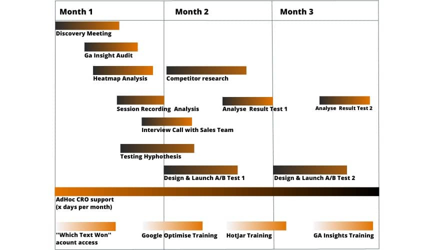 The first part of our CRO services is running a KPI workshop where we are able to understand what is important to your business. After understanding what’s most important then assign how many resources it will take to complete each task. From here we can weigh each task by its importance to you and how many resources it will consume.