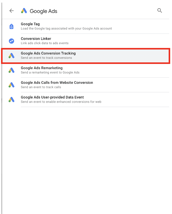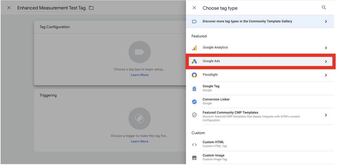 Name your tag and choose ‘Tag Configuration’. Then, select ‘Google Ads’ and finally, ‘Choose Google Ads Conversion Tracking’.