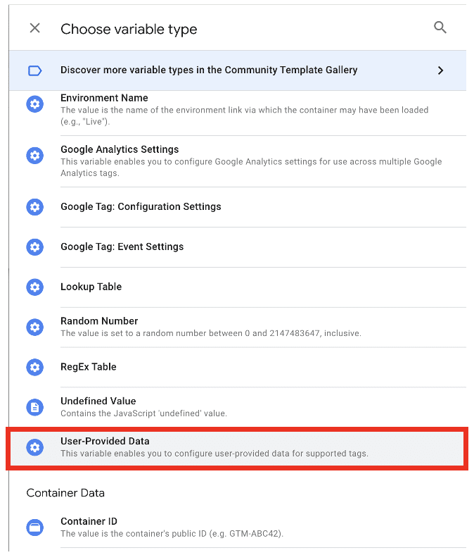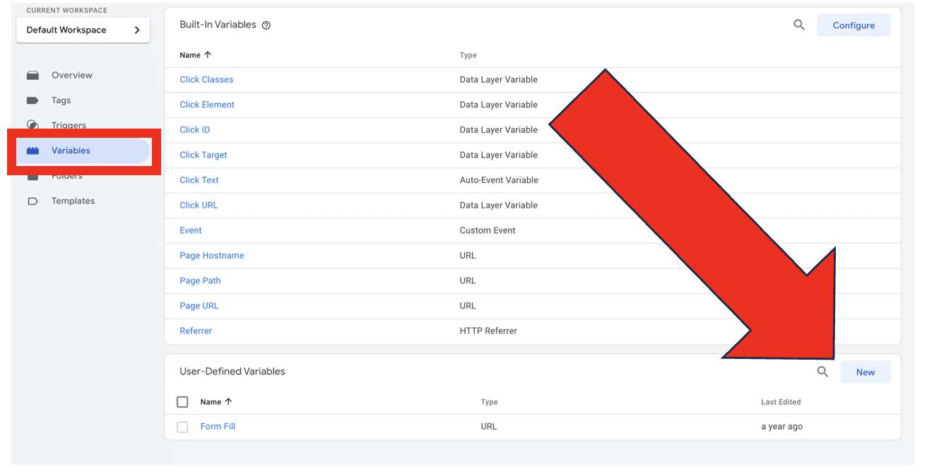 Now, let’s head to the ‘variables’ tab within GTM. From here, we’ll create a user-defined variable.