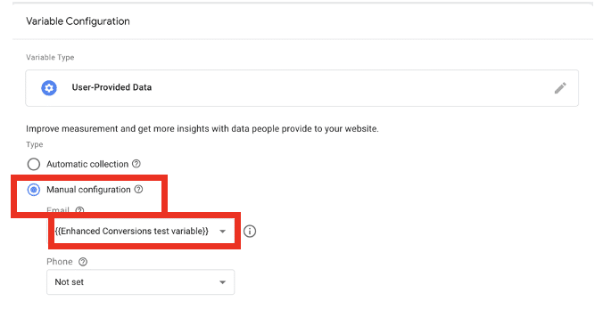 You’ll now be taken to another configuration page. From here, select ‘Manual configuration’. Under email, select the variable we have just created. Finally, choose save.
