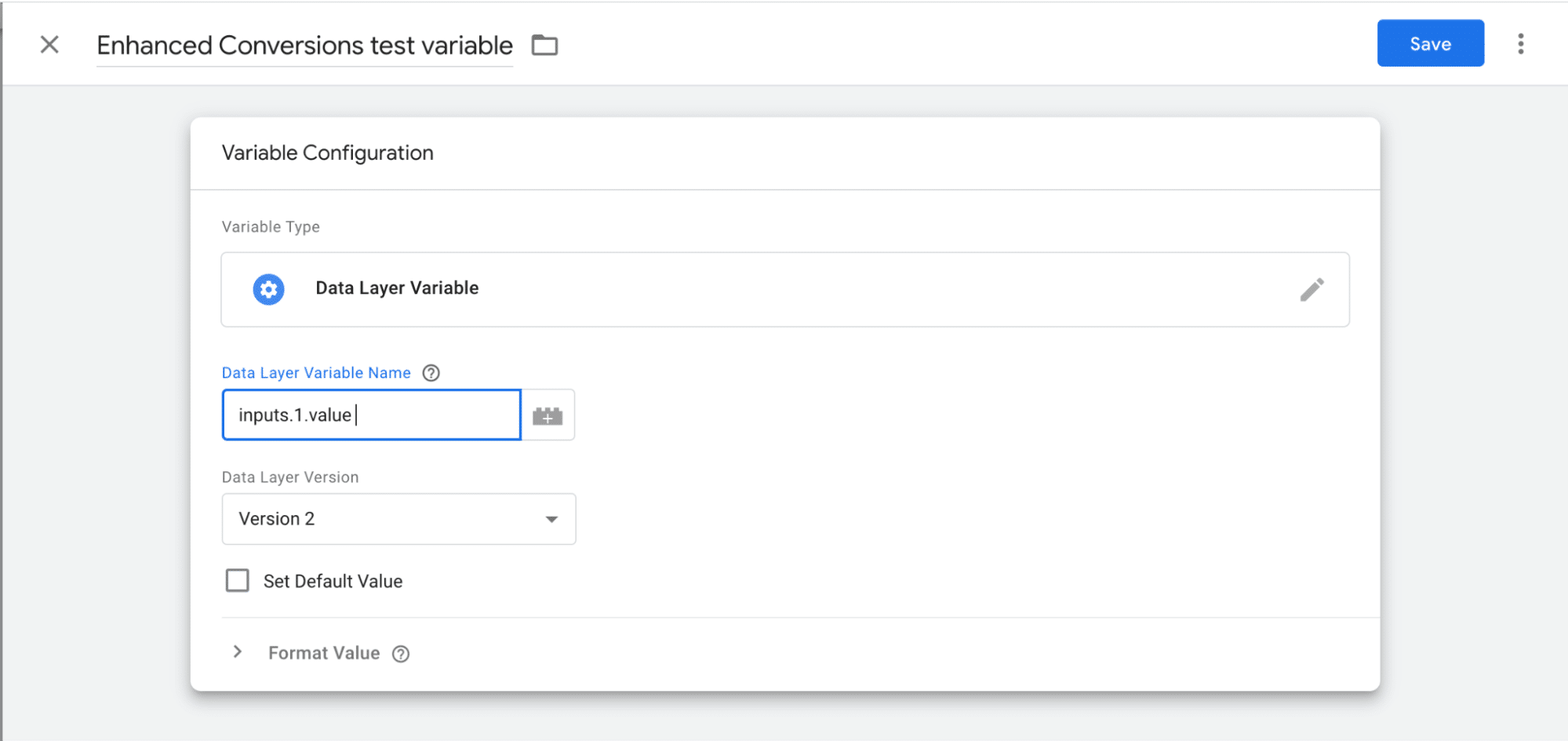 Name your variable and then begin configuration. Choose ‘Data layer variable’, which is located under ‘Page Variables’. Choose ‘inputs.1.value’ and then hit ‘Save’.