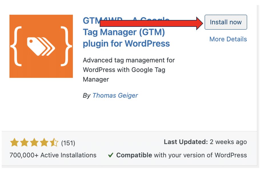 From the plugin store, search for two plugins ‘Contact Form 7’ and ‘GTM4WP’. Select ‘Install now’ once you locate the correct plugins from the list.