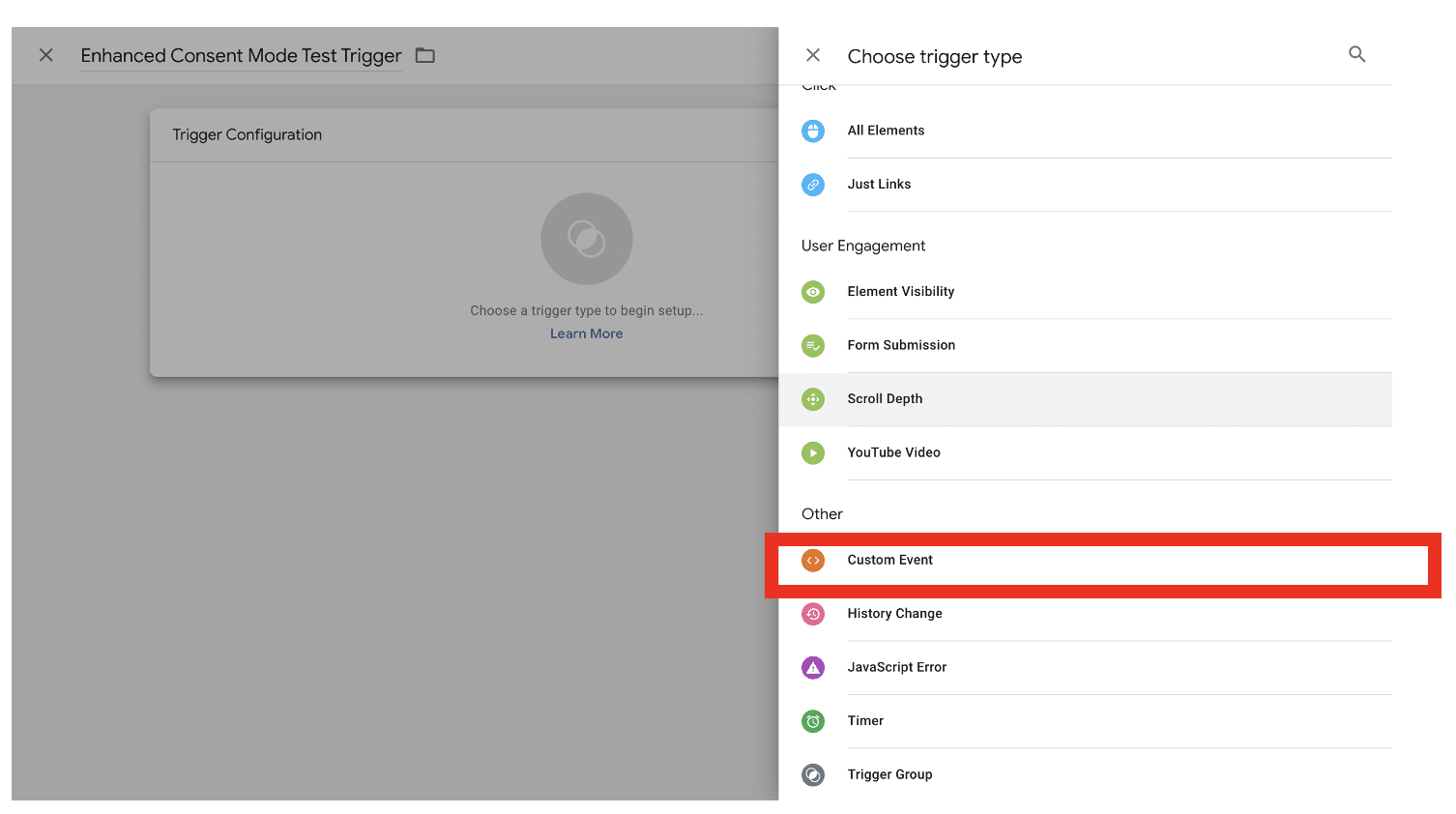Name the trigger and then choose ‘Trigger configuration’. Scroll down the list of trigger types until you find ‘Custom Event’.