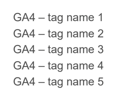 It’s important to think about data visualization in terms of GTM tag naming. Below are some examples of GTM containers that we took over. Every tag started off in the same way–the company name, followed by ‘GA4 event’.