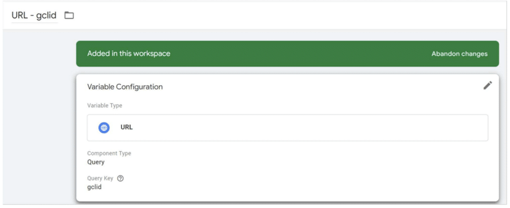 Grab the custom Google Click ID and store it within the Google Tag event settings. You should set this up as a query (an example is shown below). The reason for this approach is that it is extremely useful for recording offline conversions.