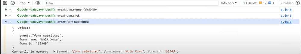 Let’s look at the DataLayer approach in more detail from our example (shown below). It has to have a ‘form_submitted’ event, a specific form_name, and a form ID. Thanks to the dataLayer push, we can grab all this information in GTM.