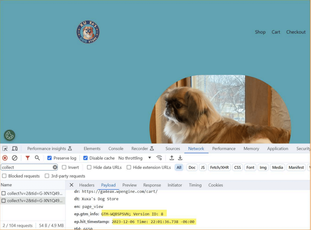 Let’s put the points we’ve discussed so far into action. The image below shows some of the elements that show up on our site. This includes a GTM container and version ID, and the human-readable hit timestamp.