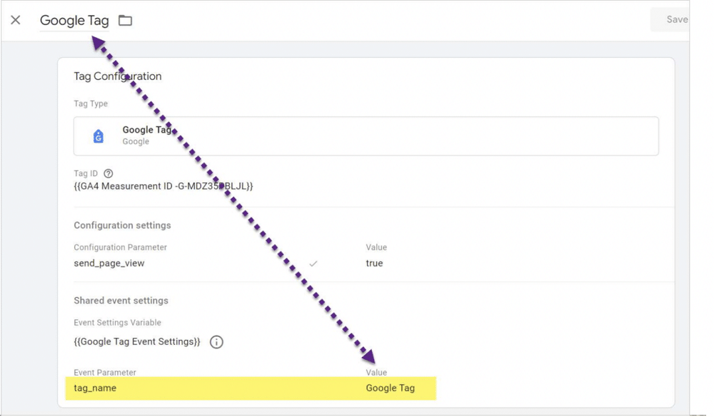 Out of all our Google Tag Manager best practices, this is probably number one. Have a custom parameter ‘tag_name’ and copy the name of your tag into the value field. The reason is that in GA4, there are so many event sources. An event could come from