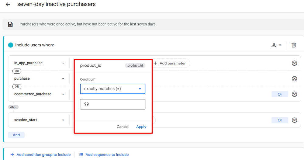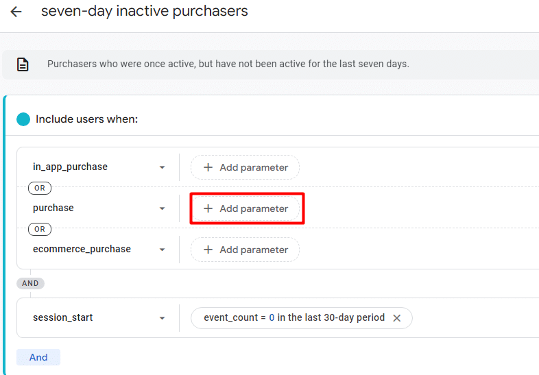 Imagine you run an e-commerce platform that sells skincare products. One of your best-selling items is a facial serum that, on average, lasts about a month. You want to remind and encourage customers to repurchase this serum or related products once they’re likely to be running low. Here’s how you can tweak the “seven-day inactive purchasers” audience in GA4 for this purpose. Once you select that general audience, it’ll take you to a page as the following: