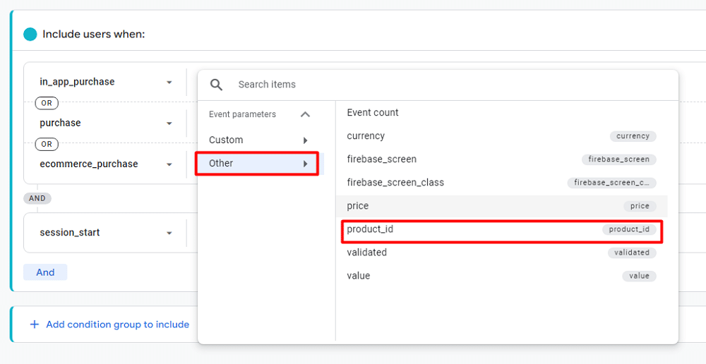 Now go to “Other“, & from the drop-down list of parameters, select “product_id“.
