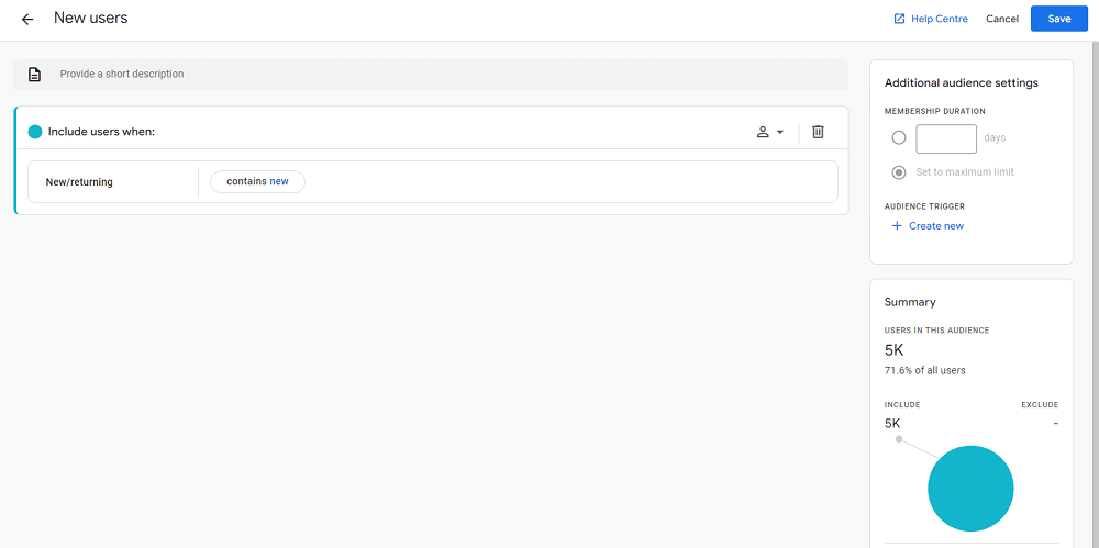 If you have multiple ‘thank-you‘ pages, ensure your conditions are specific to capture the right audience. Name your audience and save it. You can also add a brief description for future reference.