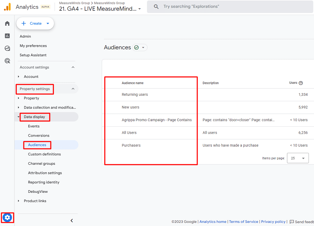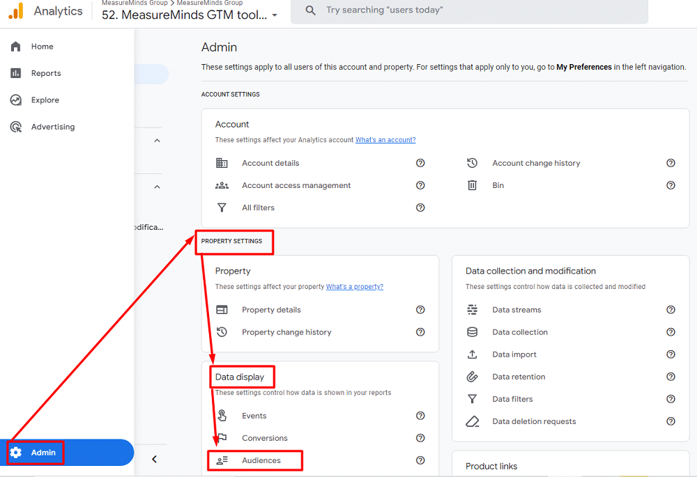 Step 1: Navigate to the “Admin“, then select “Audiences” from the “Data display” section, which is under the “Property settings“.