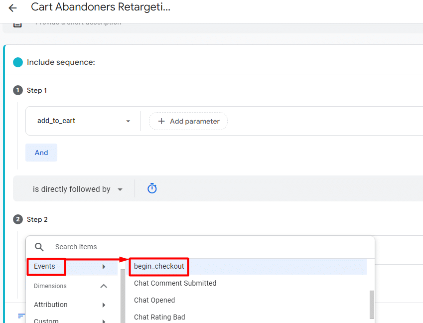 Step 11: Introduce another condition using “Add a new condition.” Select “begin_checkout” from “Events” to target users who initiated but didn’t complete the checkout process within the set timeframe.