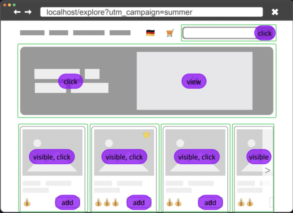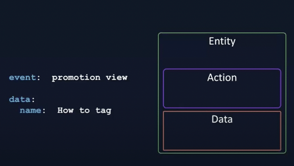 Alongside entities, we have actions. We can click on products or promotions and be redirected to new pages. If we were to select a promotion, for example, we’d trigger a ‘promotion_view’ event.