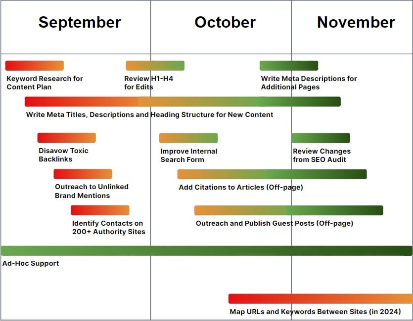 For an SEO audit to be of maximum value, it should include an indication of how much benefit fixing each issue will provide, plus the resources required. Then you can plan out over the following months when you’ll execute the various tasks.