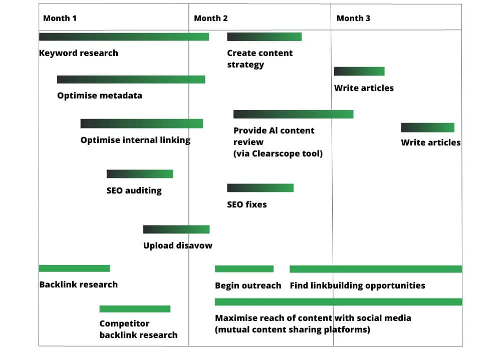 Like all of our services, our SEO implementation can be totally customised to your business needs. Maybe you just need help with the technical aspects of SEO. You might need help with building a content strategy, but already have an in-house PR team for off-site. Perhaps you’re struggling to build brand visibility and need to focus on off-site SEO. Or any combination of the three…