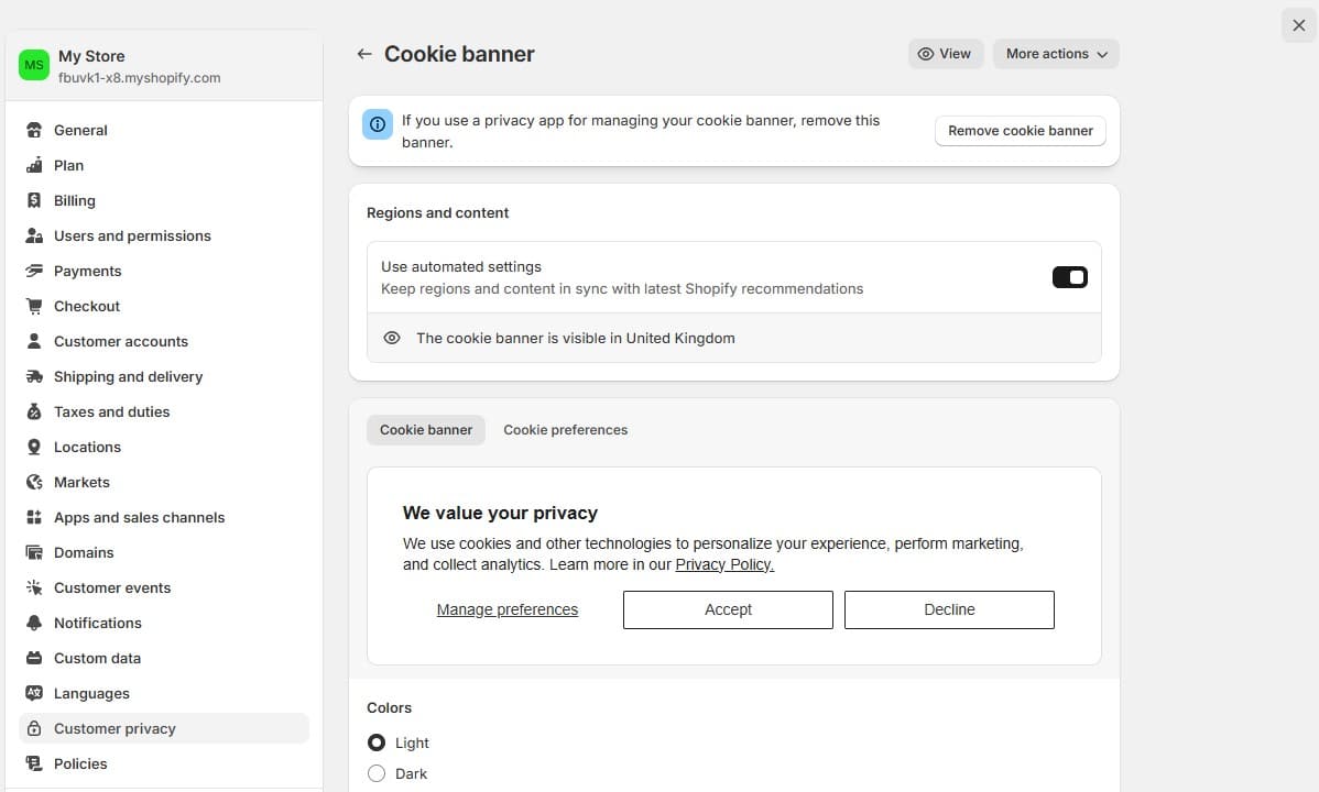 Then, choose ‘Remove cookie banner’ from the next screen, if you’re using a third-party banner, otherwise, simply make sure Shopify’s built-in cookie banner is active.